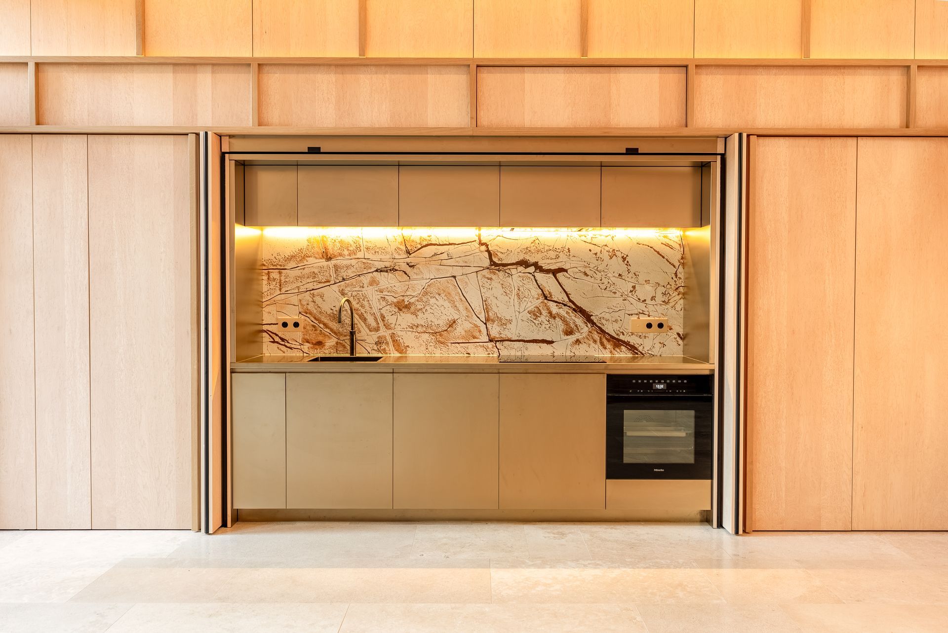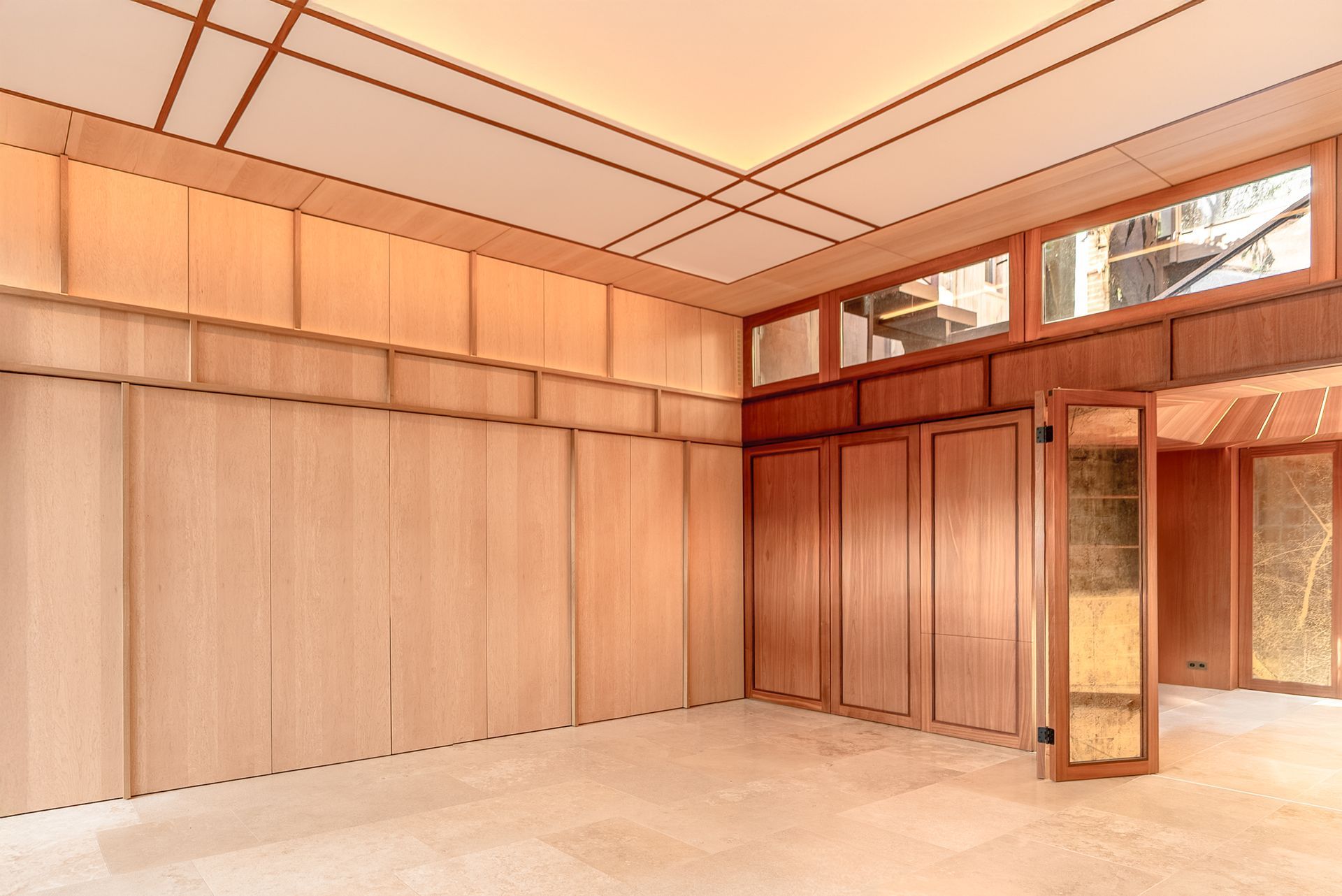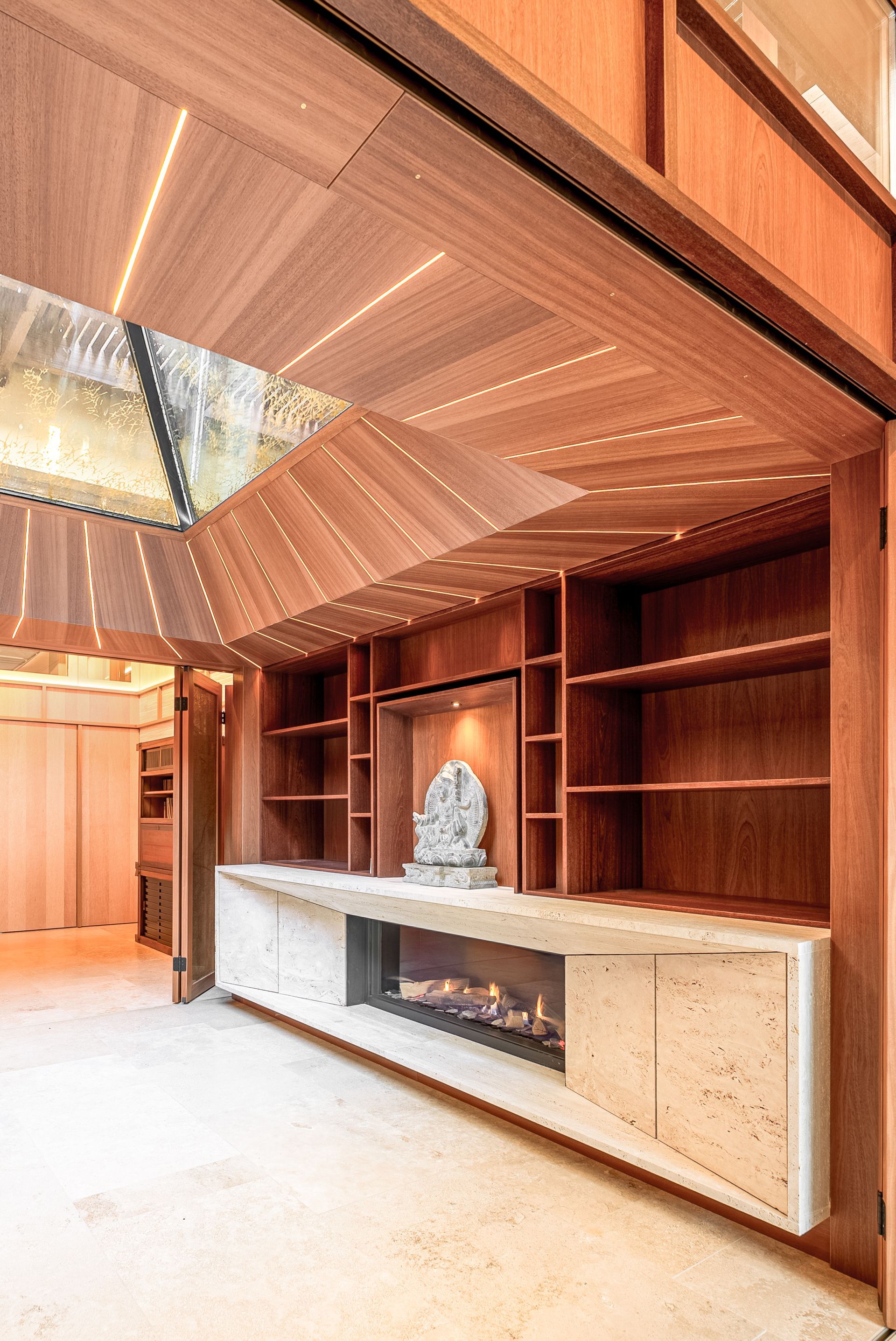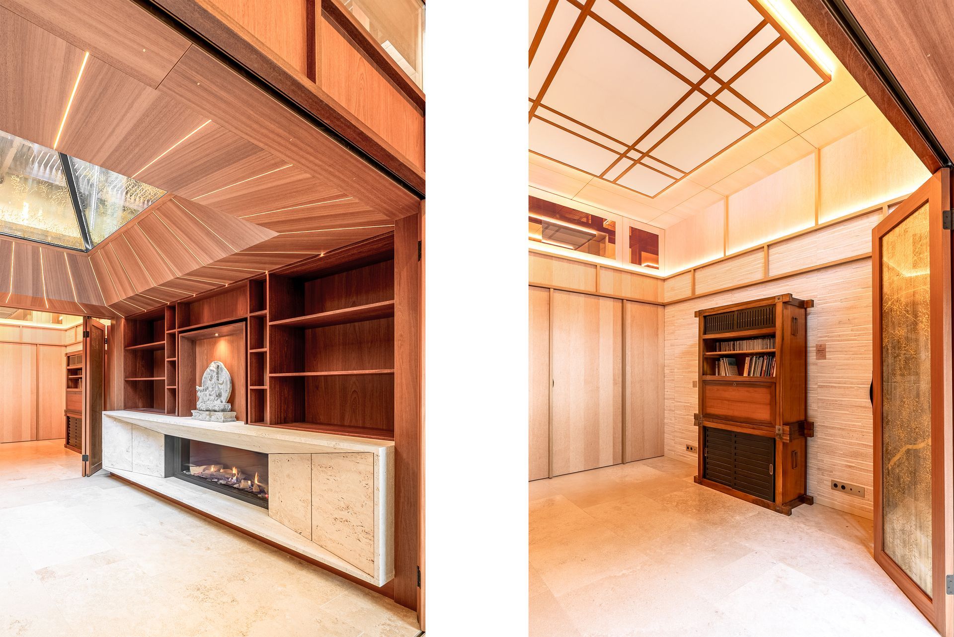 The resulting design offers three distinct yet interconnected spaces. Each is tailored for specific purposes: private retreat, hosting gatherings, or meeting clients. The study stands as the focal point of the transformation, defined by its refined selection of warm timbers and travertine stone, creating a harmonious and timeless aesthetic.